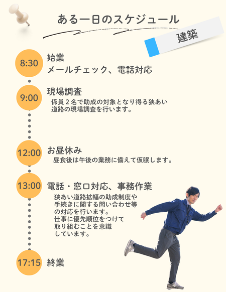 建築課では、狭あい道路の拡幅を希望される地権者への助成金の支給や、区が拡幅整備するような助成制度を扱っています。それに伴う現場調査や書類審査の業務を担当しています。