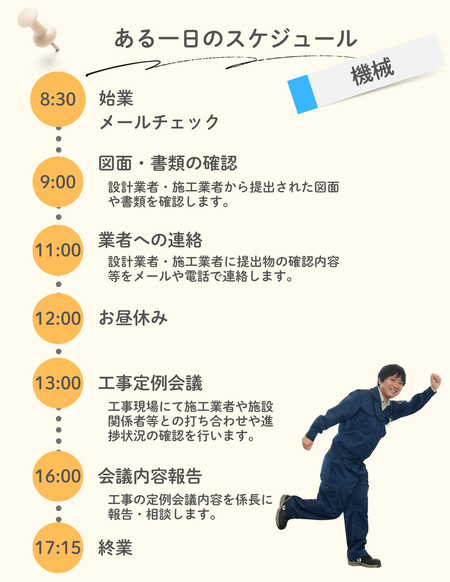 学校の空調機や衛生設備など機械設備に関わる改修工事および設計委託の監理業務を担当しています。具体的には、施工者、設計者との打合せや、現場・書類・図面などの確認作業を行っています。