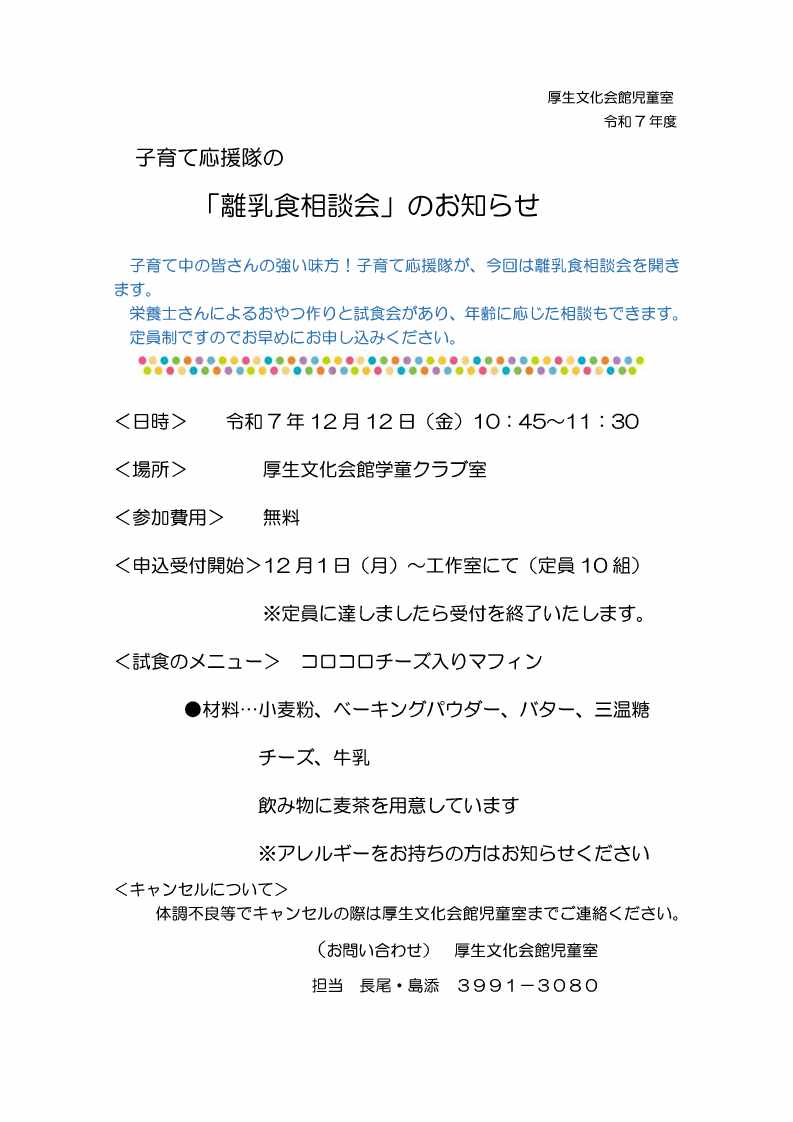 栄養士さんによるおやつ作りと試食会。食にかかわる相談もできます。