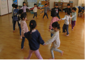 年間を通して、リズムの先生を招いて、リズム遊びを0歳児から5歳児まで行っています。ピアノの音に合わせて、身体を動かしたり、手足の先まで神経を張り巡らせたり、楽しみながら健康な身体づくりをしています。